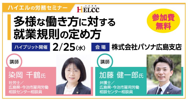セミナー・講演情報2026.02.132026年2月25日(水)【参加無料】HiELCC 広島県・今治市雇用労働相談センター様主催 労務セミナー「多様な働き方に対する就業規則の定め方」への登壇のお知らせ 2026年2月25日(水)に、当事務所 弁護士 加藤 健一郎がHiELCC 広島県・今治市雇用労働相談センター様主催の労務セミナーに登壇いたします。 詳細・お申込みにつきましては、以下をご確認くださいますようお願いいたします。 https://hi-elcc.mhlw.go.jp/seminar_51.html