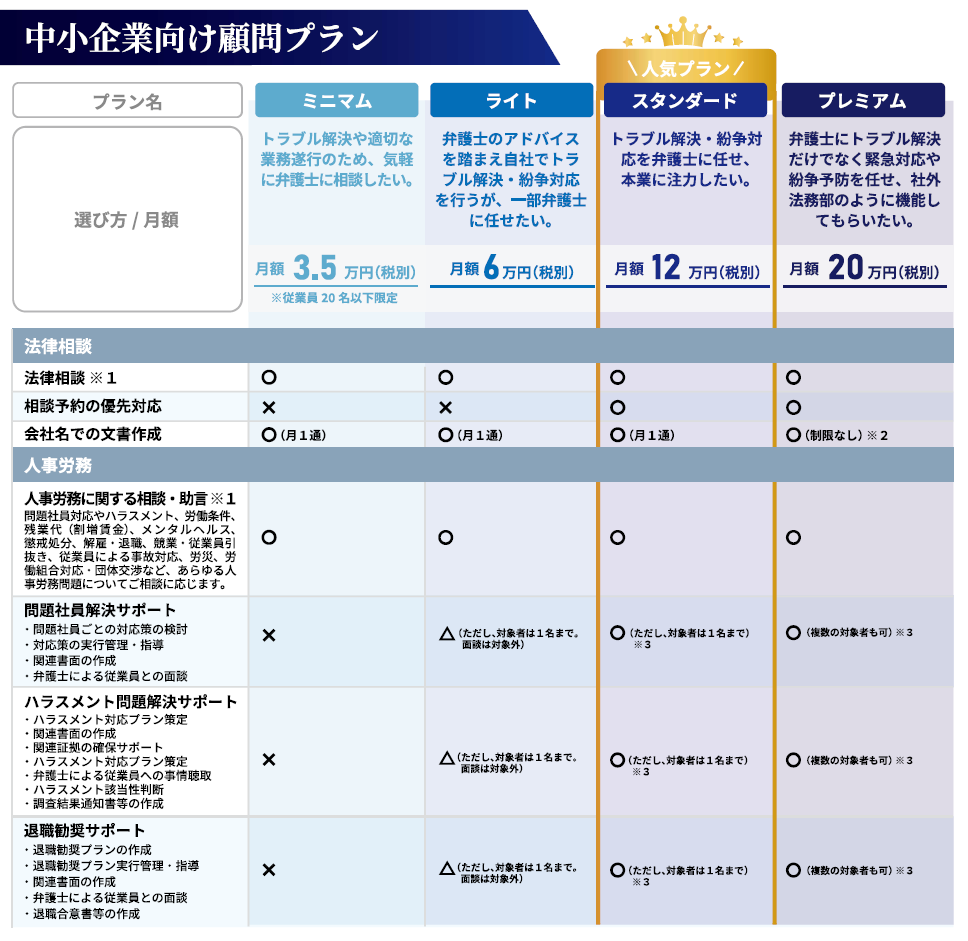 ※7:各プランに記載された項目以外の業務(訴訟提起等)を受任する場合、各プランに応じた割引を行います。会社役員及び従業員の私的なトラブル対応にも適用します。